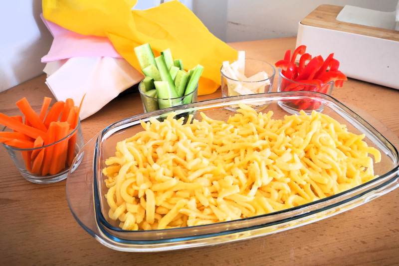 Das Mittagessen kochen wir täglich frisch. Wir legen Wert auf eine ausgewogene Ernährung. Viel Gemüse, vorwiegend bio, regional und saisonal steht auf dem Speiseplan, aber auch Fisch und Fleisch, Reis, Hülsenfrüchte, Obst und manchmal Quark und Joghurt. Und natürlich - wie könnte es anders sein - Nudeln! Zum Glück gibt es immer auch einen großen Vorrat an Vollkorn- und Dinkelnudeln bei uns.