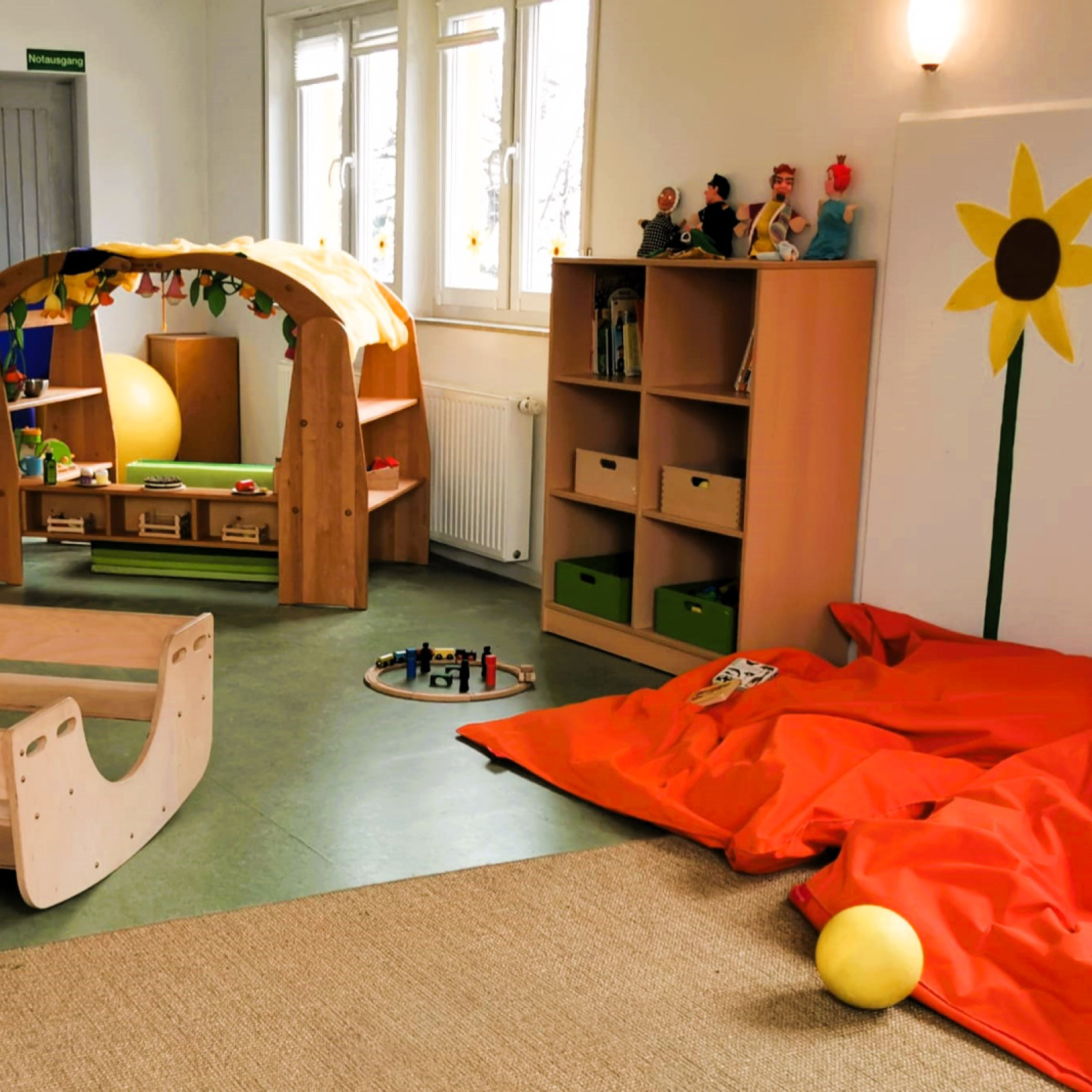 Einen Garten gibt es leider nicht, doch der Spielplatz liegt nur eipaar Schritte entfernt in der gleichen Straße. Das hübsche Wohngebiet ist locker bebaut, ruhig und sehr familienfreundlich. Und etwas weiter gibt es einpaar schöne Spazierwege in der Natur. Auch ein Pferd, Ziegen, einen Hahn und Hühner und eine Katze bekommen wir ab und zu zu sehen.